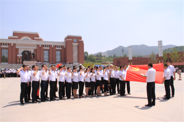 在革命前辈的雕像前,全体党员向党旗庄严宣誓,重温入党誓词。