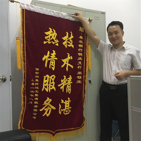 9月18日,西安众基拆迁工程有限责任公司法定代表人朱兴华先生亲自将一面写着“技术精湛,热情服务”的锦旗送至锦业支行,对支行电子渠道部员工周锡宝的工作给予高度评价并表示衷心感谢。