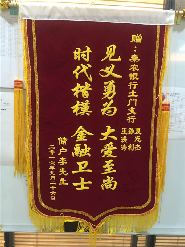 近日,一位退休职工李先生为莲湖支行辖属土门支行送来一面写着“见义勇为,大爱至尚,时代楷模,金融卫士”的锦旗,对该支行相关人员的帮助送上真诚的谢意。