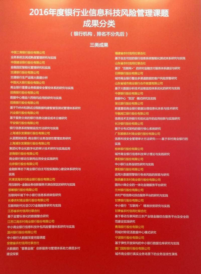 我行荣获2016年度银行业信息科技风险管理课题研究三等奖
