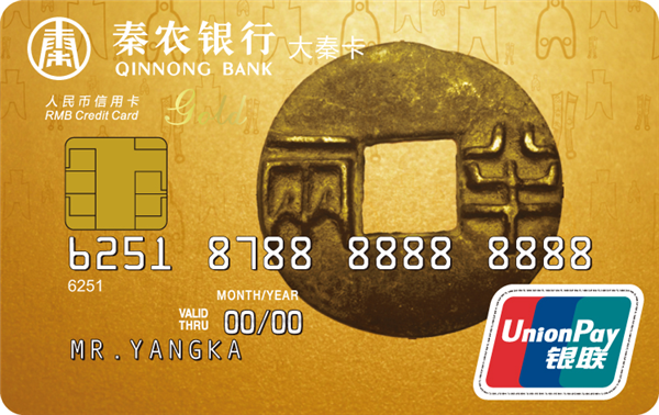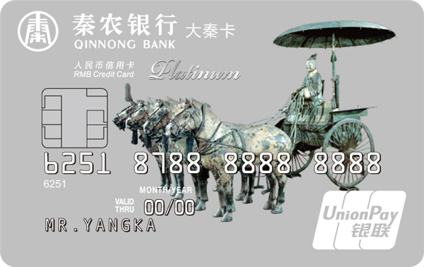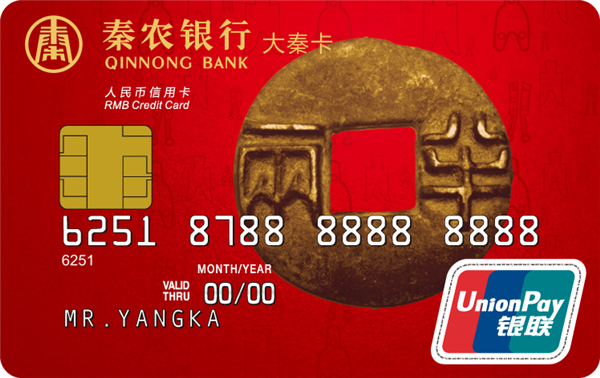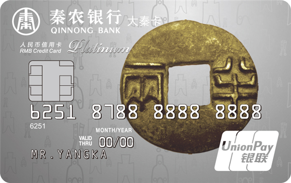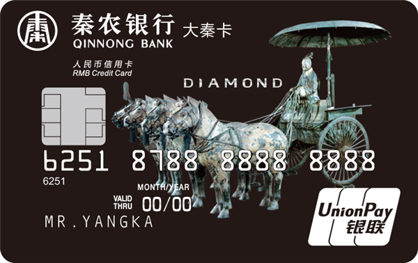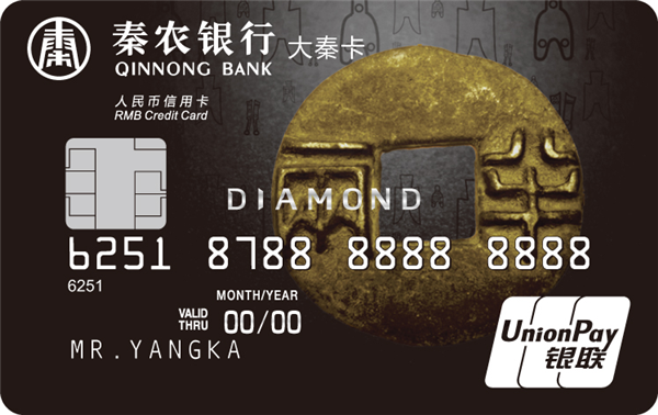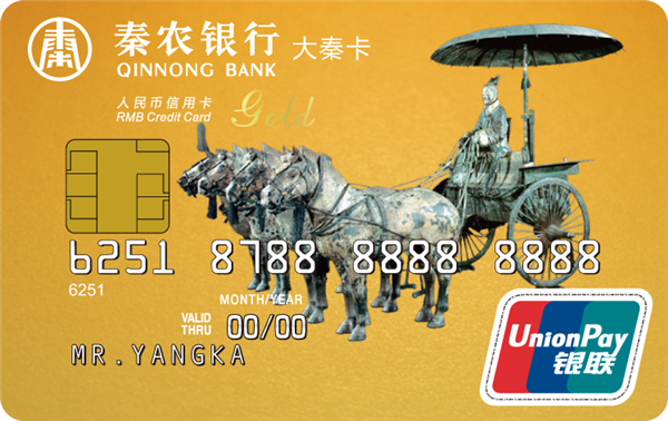 大秦信用卡是具有循环信用功能的贷记卡,目前主要分为普卡、金卡、白金卡和钻石卡,卡面有“秦半两”与“铜车马”两种样式。“秦半两”系列以半两钱币为卡面主体形象,突出的字面采用浮雕工艺,以历代货币为背景衬托,既体现了朝代更替,兴衰推演而终归大秦一统的历史意义,又将古典审美的尊贵感与现代设计的简约感结合,造就了外圆内方的唯美意境。“铜车马”系列以威严的车马造型为卡面主体形象,栩栩如生的造型,厚重的青铜质感给人以稳重、坚实的力量象征,充分代表了秦农银行团结拼搏、力争上游的奋斗精神。