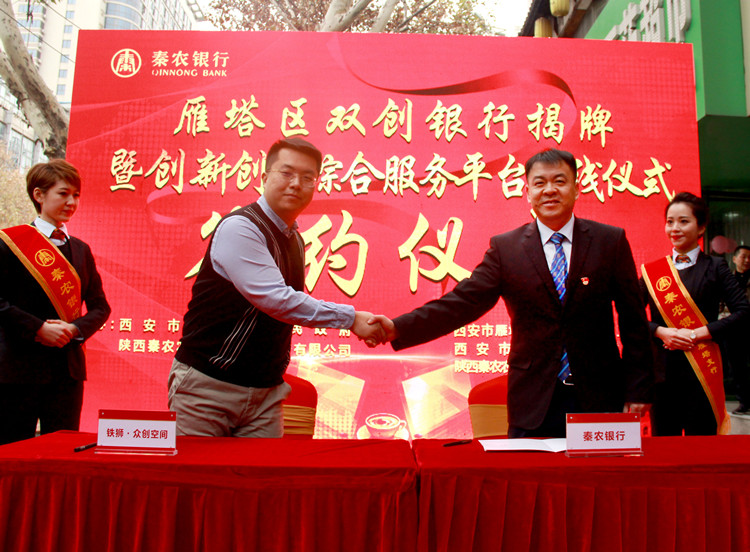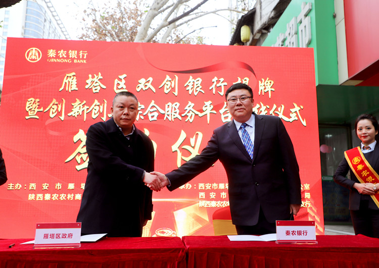 在各方共同见证下,秦农银行党委副书记、行长郝光耀,雁塔区委副书记、代区长赵雷共同为雁塔区双创支行揭牌。秦农银行公司金融部总经理孟晓宇、雁塔区金融办主任柳林分别代表秦农银行和雁塔区政府签订“双创贷”业务战略合作协议。根据该协议,双方将在资源信息共享、建立风险补偿机制、优化融资服务流程、推出适合双创企业的贷款产品等方面展开合作。