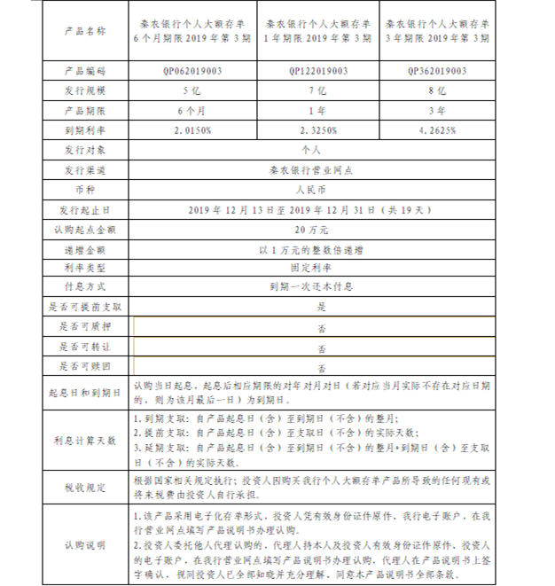 秦农银行个人大额存单2019年第3期发行公告