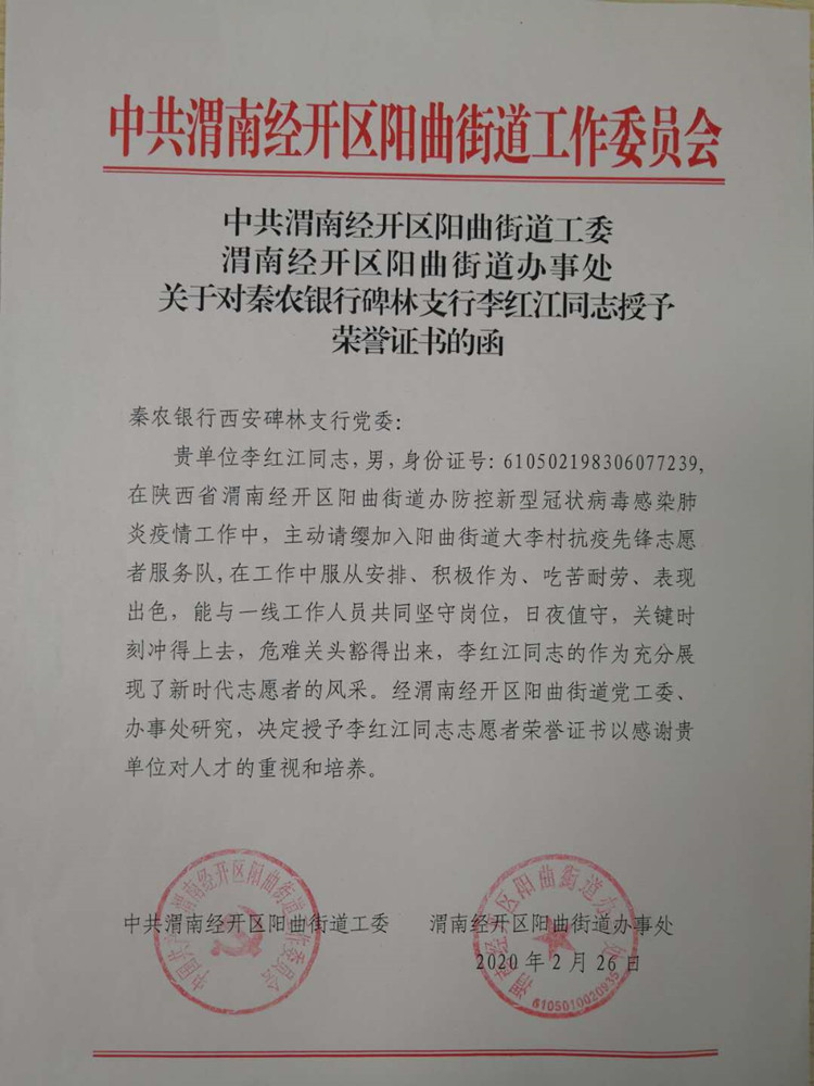 近日,秦农银行碑林支行收到中共渭南经开区阳曲街道工委发来的函件,授予李红江同志荣誉证书。
