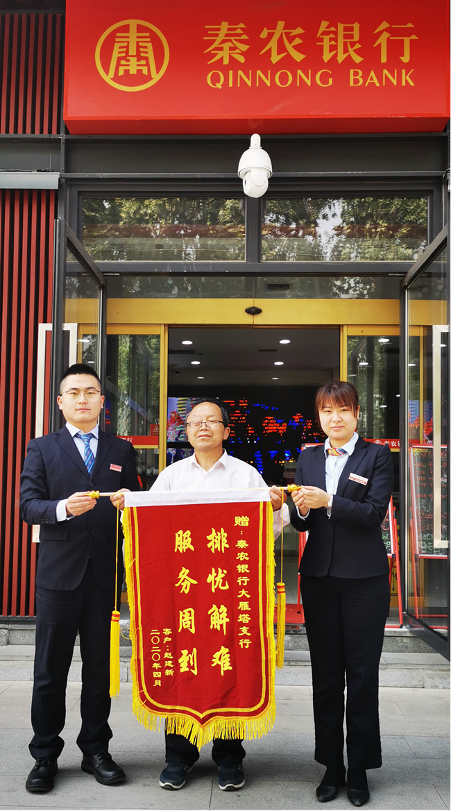 在办理完核实手续后,客户赵某新、赵某欢前往大雁塔支行办理取款业务。业务办理过程顺利,客户赵某欢拿到了其父的救命款,红着眼眶对工作人员千恩万谢,赵某新也激动万分,表扬大雁塔支行员工的服务精神,虽不是在本网点开立的存单,也能做出这么好的服务,特别是能在疫情期间主动提出愿意前往医院核实,实超出他的意料,让他倍感温暖。4月29日,赵某新拿着锦旗再次来到大雁塔支行,对他们的服务表示感谢。行内员工仍然牵挂赵某岗身体情况,在与他简短聊天过程中了解到医院已安排赵某岗近期进行手术。还得知他在其他银行办理相同业务时,多次提出我行的优质服务行为。