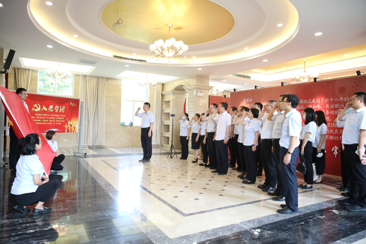 在稻地江信用社二楼展览馆内,由孟浩同志领誓,二支部全体党员面向党旗郑重宣誓、重温入党誓词,以坚定理想信念、不忘入党初心、牢记使命担当。