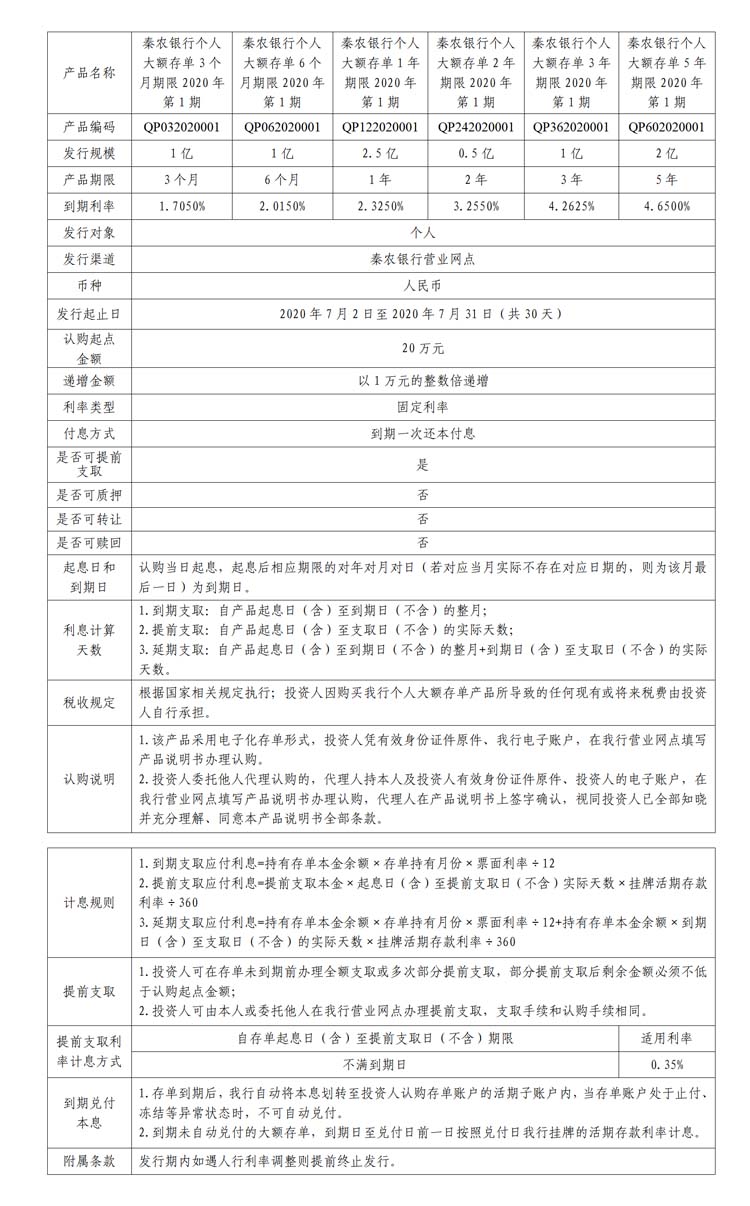 我行于2020年7月2日-2020年7月31日发行2020年第1期大额存单,投资者可通过我行各营业网点进行认购。现将产品要素公告如下: