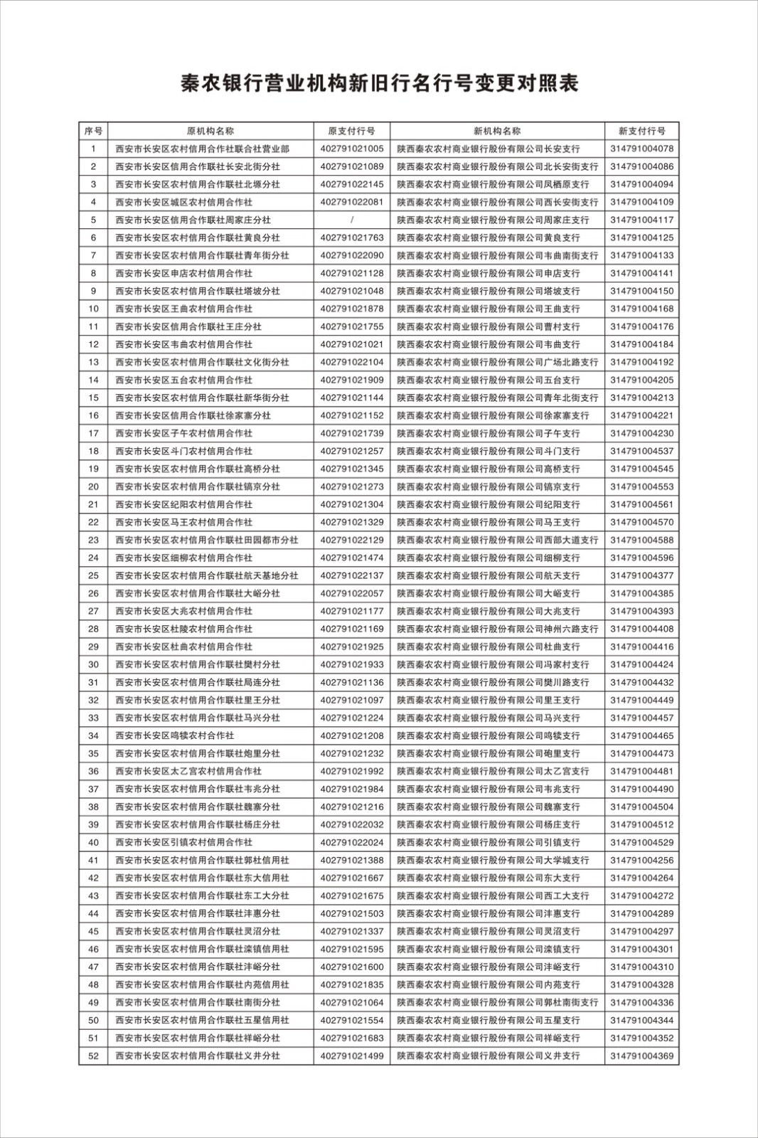 陕西秦农农村商业银行股份有限公司关于辖属长安支行等51家营业机构启用支付系统新行名行号的公告