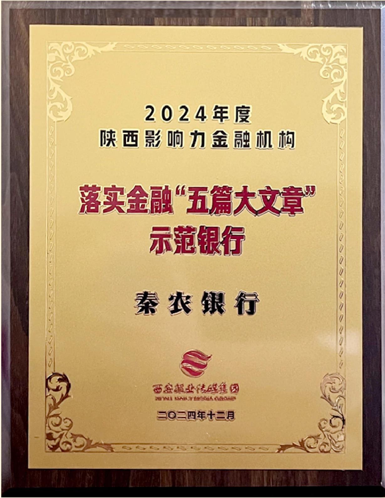 近日,西安晚报发布了“启新程 创未来——2024年陕西金融机构做好‘五篇大文章’巡礼特辑”,我行荣获“2024年度影响力金融机构——落实金融‘五篇大文章’示范银行”和“2024年度影响力金融机构——普惠金融示范银行”两项荣誉。