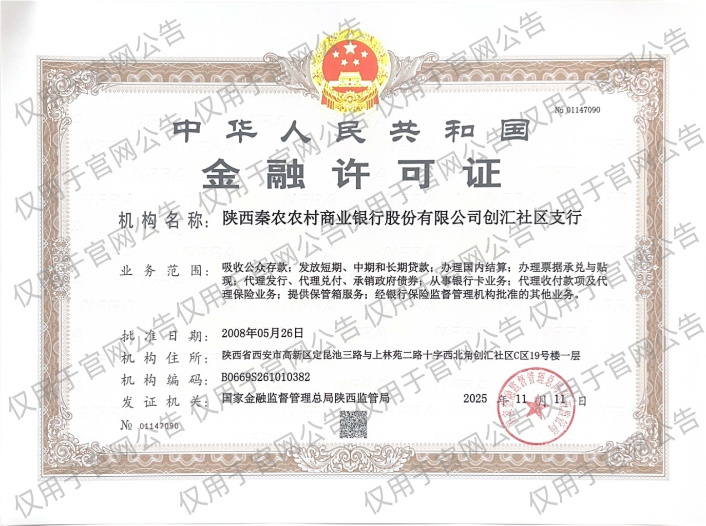 秦农银行关于创汇社区支行开业并换领《金融许可证》的公告