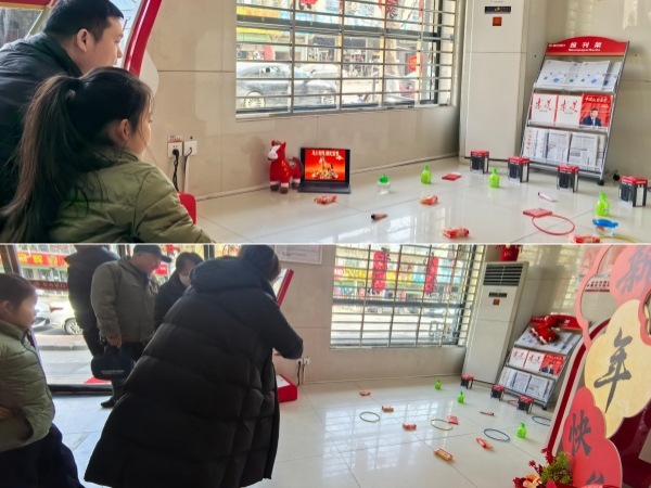 活动前期,支行精心筹备部署。大厅内悬挂中国结、张贴马年主题窗花、搭建新春背景板,营造浓厚喜庆氛围;设置长1.5米、宽1.5米的套圈场地,礼品分三等有序摆放,一等奖小金鱼吉祥物寓意“年年有余”,二等奖定制新春福袋承载“龙马精神”期许,三等奖实用生活用品传递贴心关怀。同时安排专人负责现场引导与规则讲解,确保活动有序开展。