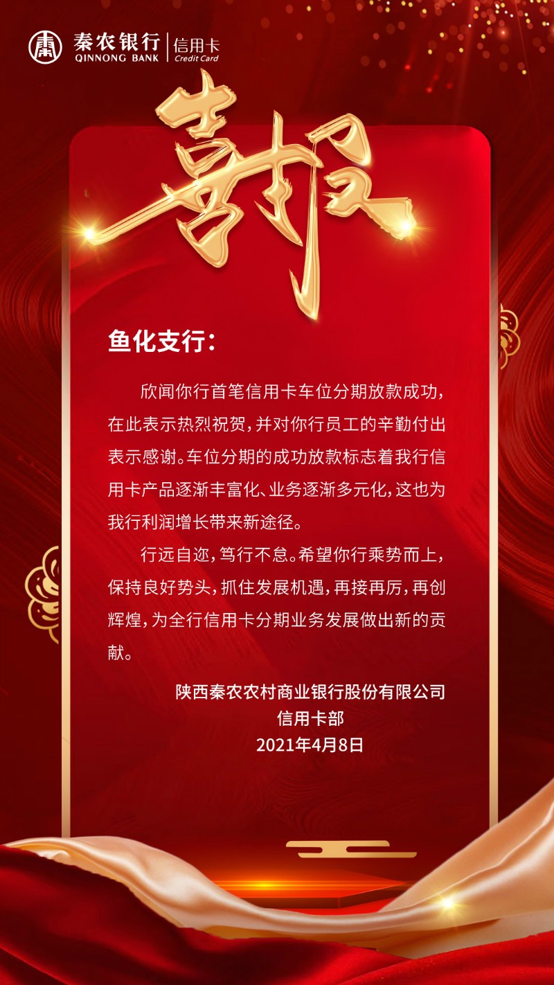 4月7日,由总行开发的“秦农银行信用卡车位分期(信用)付款业务”在鱼化支行正式上线运行,在总行信用卡部的多次现场指导下,鱼化支行成功办理了全行首笔车位分期业务。