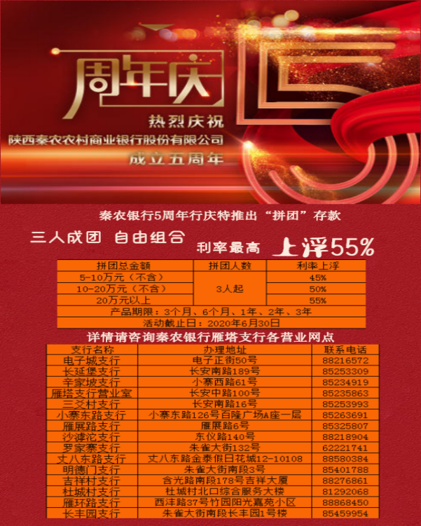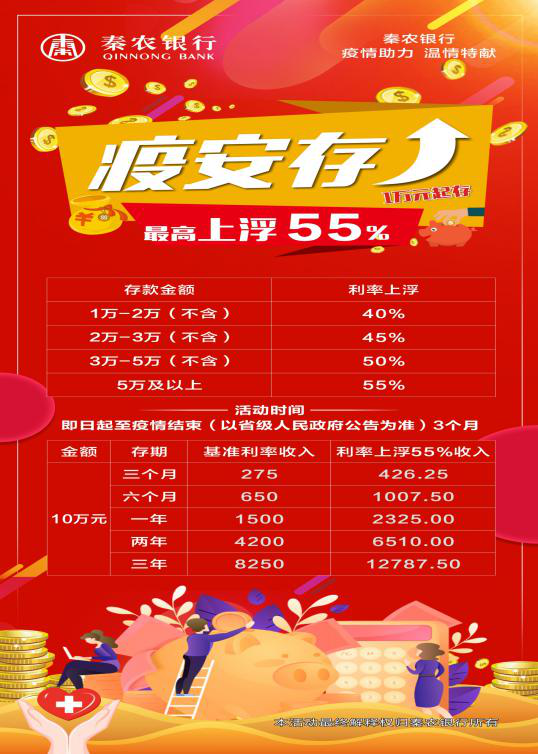 行庆活动期间,继续执行协商存款利率上浮至55%,起点金额20万元,期限包括3个月、6个月、1年、2年和3年。